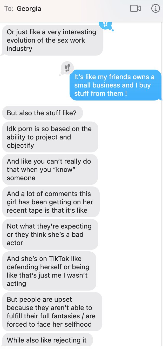 Thus is the trap of modern day porn production. With the advent of social media, and the guise of closeness it offers, it’s no longer enough to just be sexy. One also has to create and sustain a sphere of parasocial relationships; maintaining enough of a persona, both within and outside of sex work, that their audience can consistently project a set of fantasized ideals. In one video, Ari acknowledges that the product she profits from most is not just thirst traps or nudes, but her “personality”. In addition to being a sex object, bop, and mattress actress, she also has to be a #relatable friend, girlfriend, and crush.