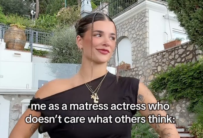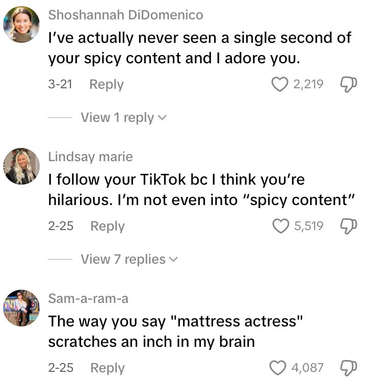 for looping me into this TikTok drama and for providing the core analysis of this essay. See screenshots (below) for credit where credit is due xxRT: for me, it was refreshing to see that even a drop-dead gorgeous mattress actress gets a little nervous during sexy time.