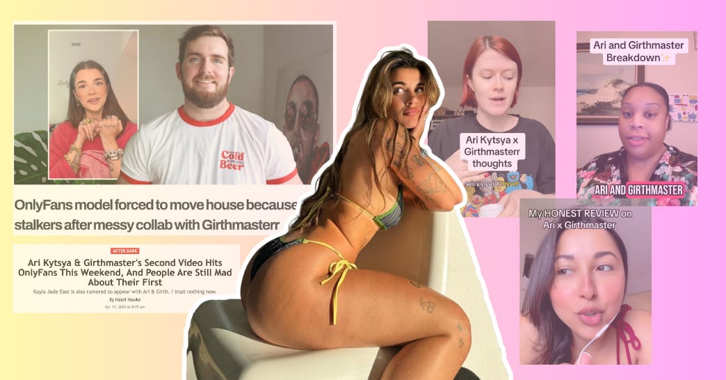 Ari Kytsya’s latest OF video is going viral. Not because it was particularly good, but rather, because it was unexpectedly lackluster. Her newest film, which was teased and promoted on TikTok for weeks prior, features her and fellow influencer Girthmasterr, going at (what looks like) twenty minutes of clumsy, amateur sex, filmed on a wobbly iPhone camera at 0.5 lens.1